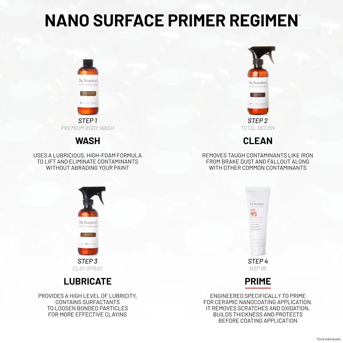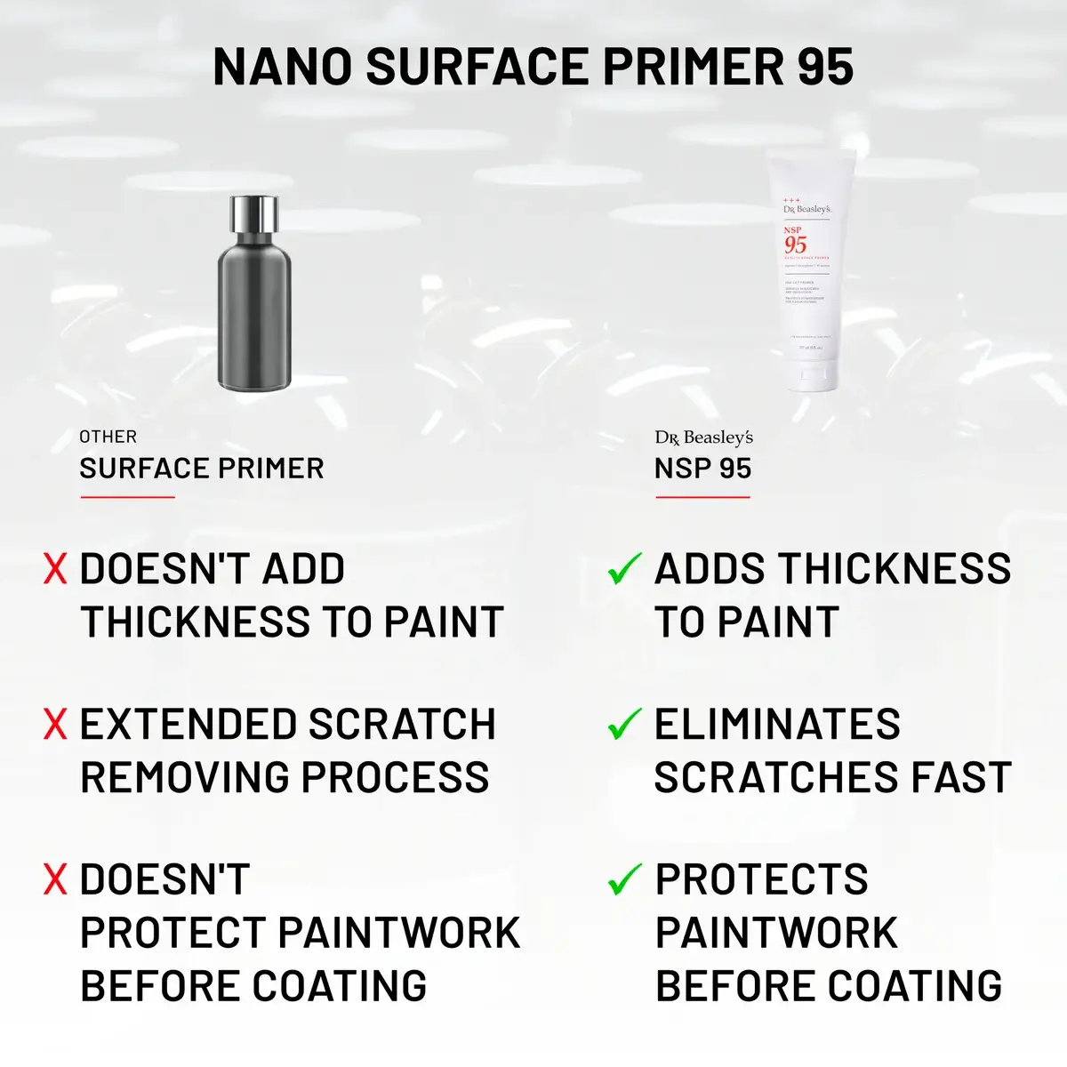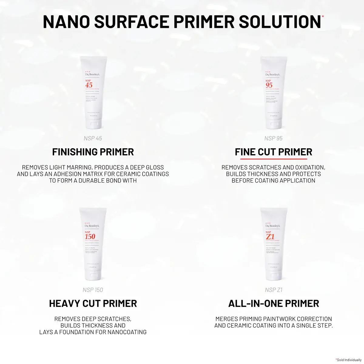 Dr. Beasley’s NSP 95 is a fully inorganic fine cut primer, engineered specifically to prime for ceramic nanocoating application. It removes scratches and oxidation, builds thickness and protects before coating application. Use NSP 95 to tackle scratches and oxidation of mild severity prior to finishing with NSP 45.