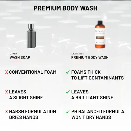 The dirt and grime you see on a car’s surface is really only a fraction of the gunk lurking within your car’s paint thanks to the environmental contaminants and industrial fallout that slowly embed themselves into your finish. To rid your paint of every last bit of dirt, Dr. Beasley’s Premium Body Wash creates a thick foam over your paint that lifts and traps embedded contaminants, allowing them to be rinsed away with ease. Once you see the suds, you’ll have confidence knowing Premium Body Wash is eliminating all of the contaminants, even the ones buried deep inside.