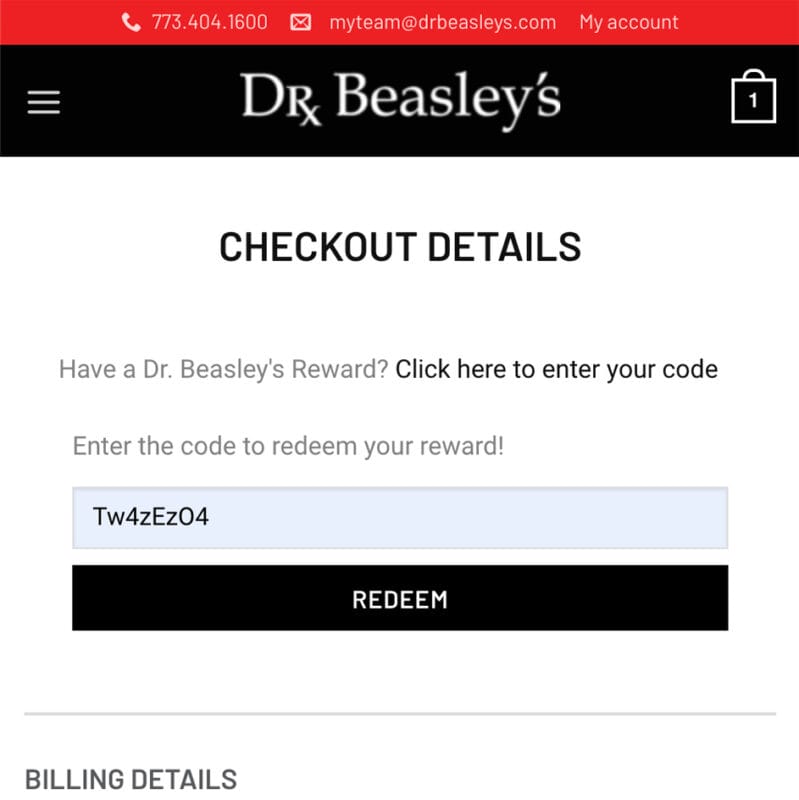 Points are also able to be earned by submitting product reviews, subscribing to our emails, following Dr. Beasley’s on social media, creating an account, uploading a photo to a product review, or sharing Dr. Beasley’s on social media. A special coupon can also be earned by a referrer and referee for the first order a referee places.